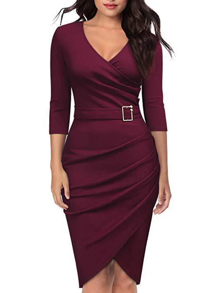 Elegant Fall Bodycon Short Dress Women Long Sleeve V Neck Slim Fit Work Robe Female OL Lady Solid Everyday Dresses
