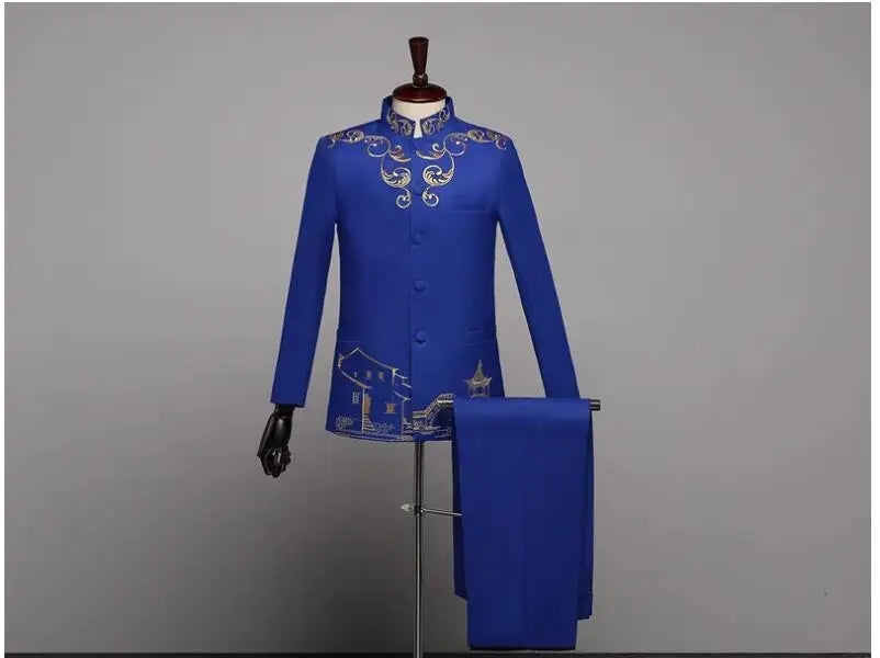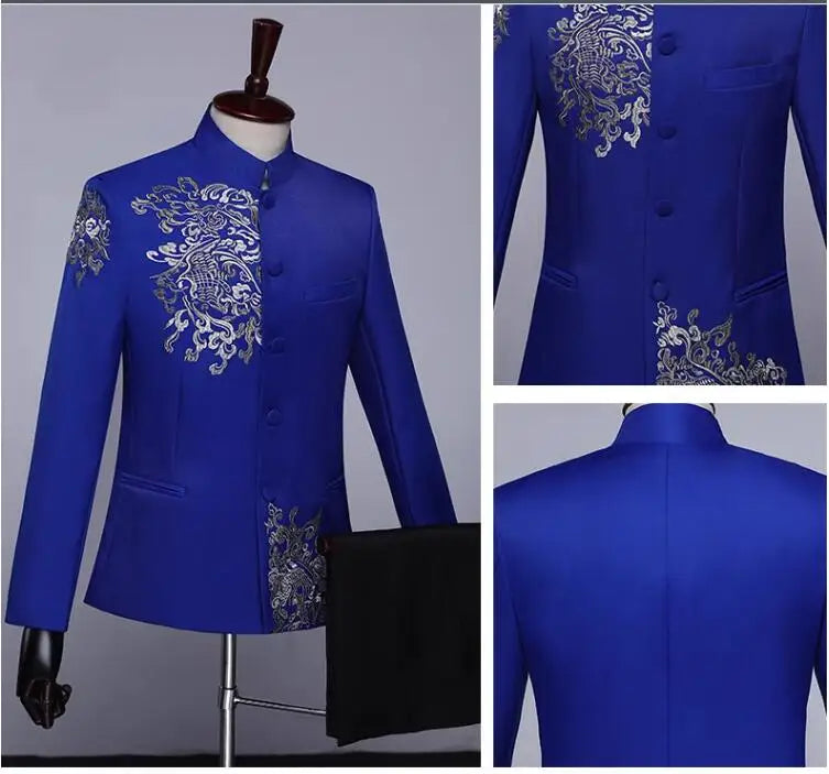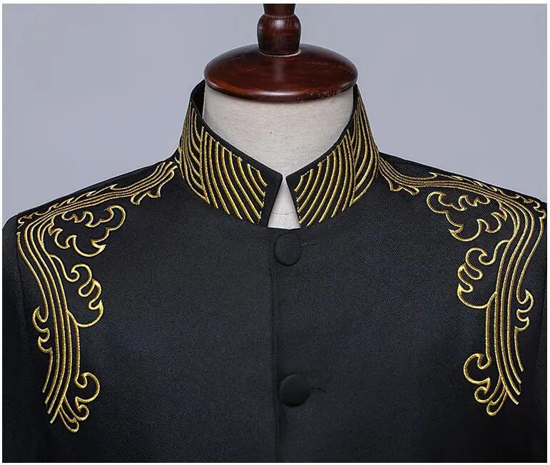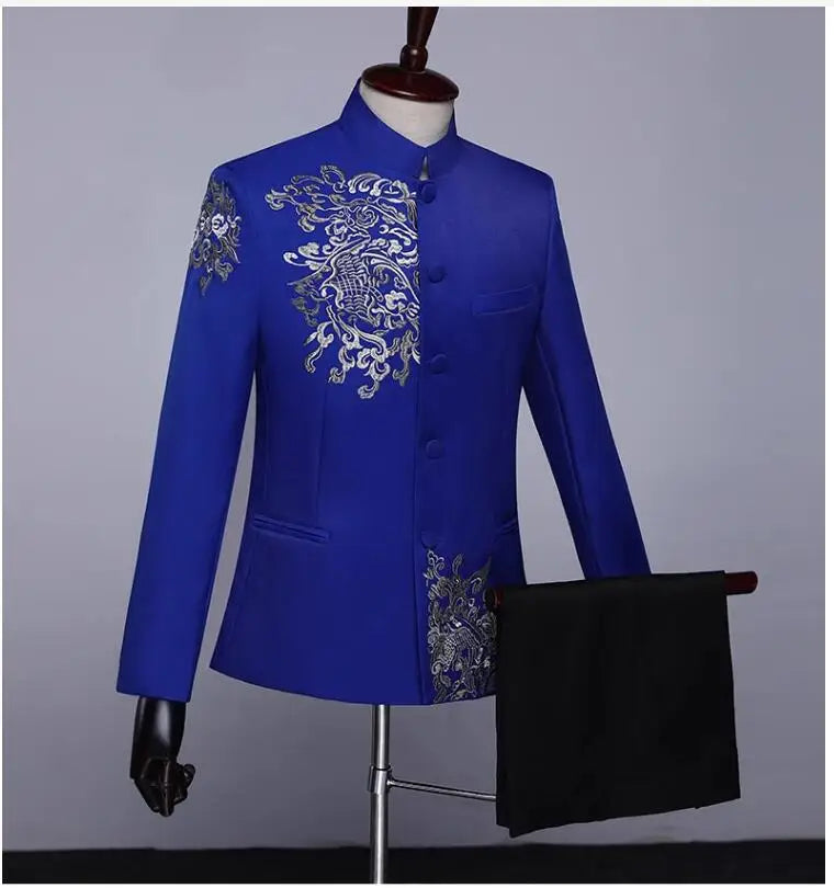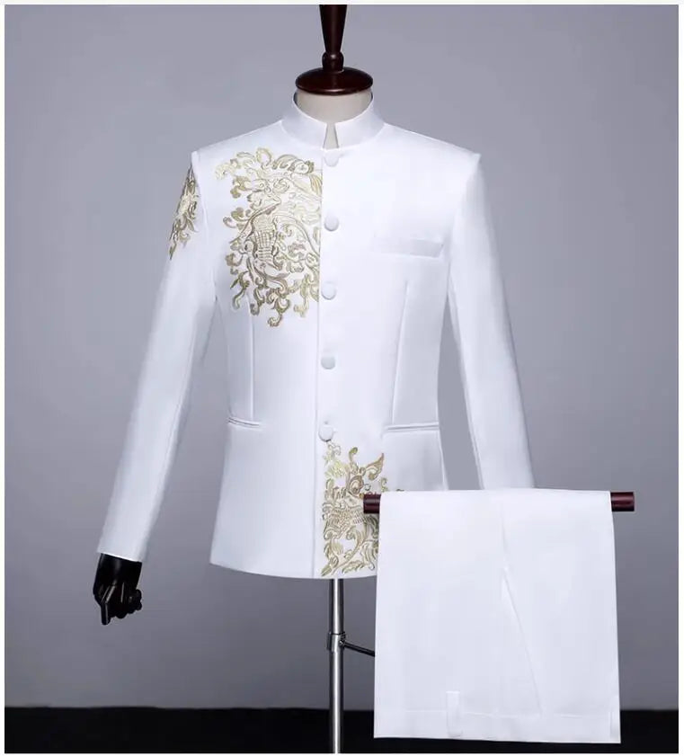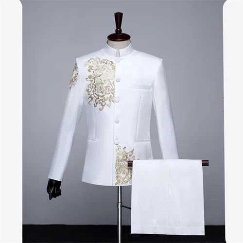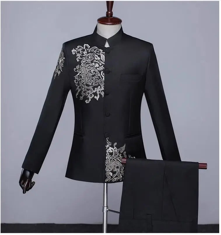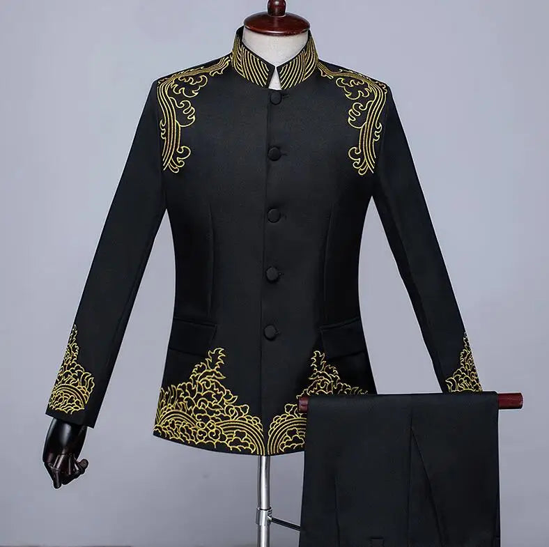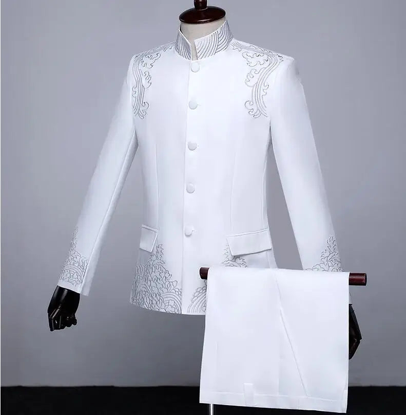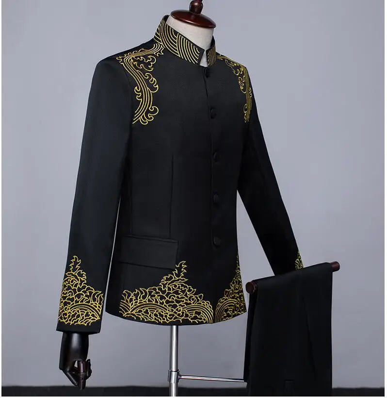 New Men Standing Collar Embroidered Suit 2 Piece Fashion Male Business Social Wedding Prom Stage Performance Dress Blazer Pant