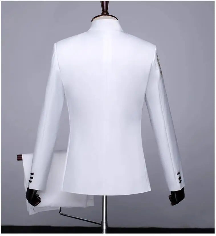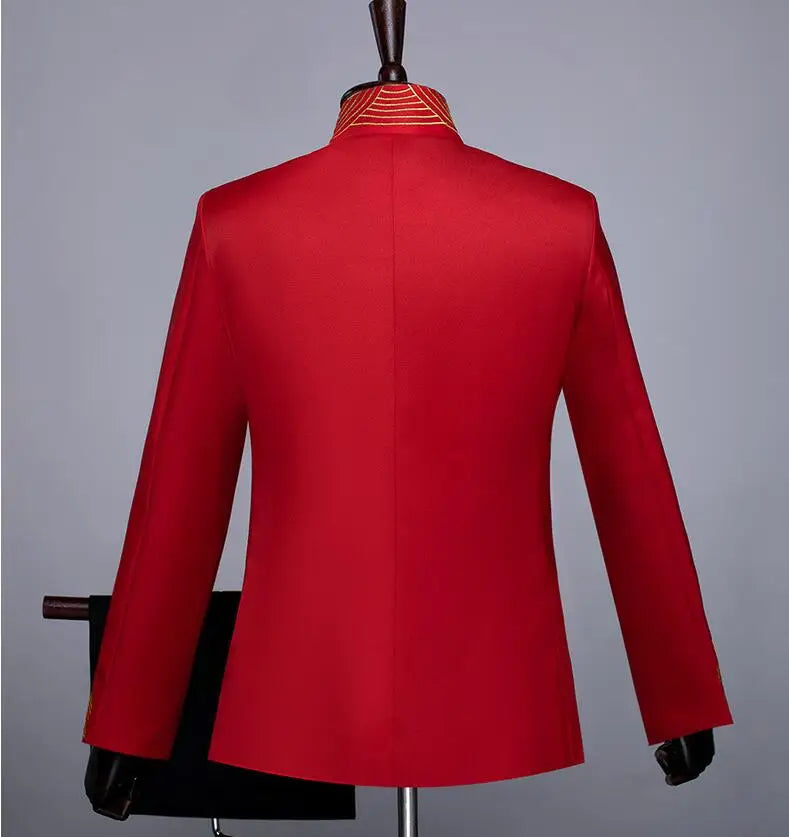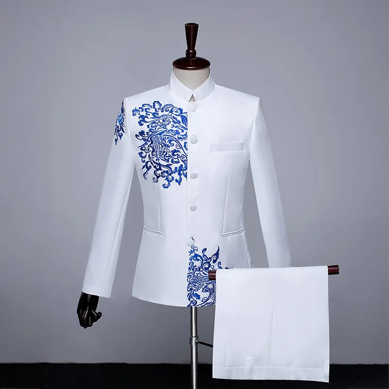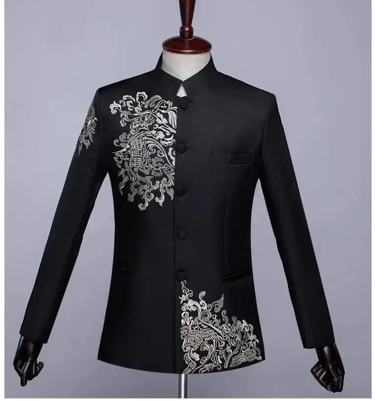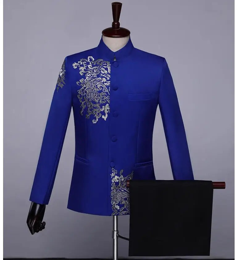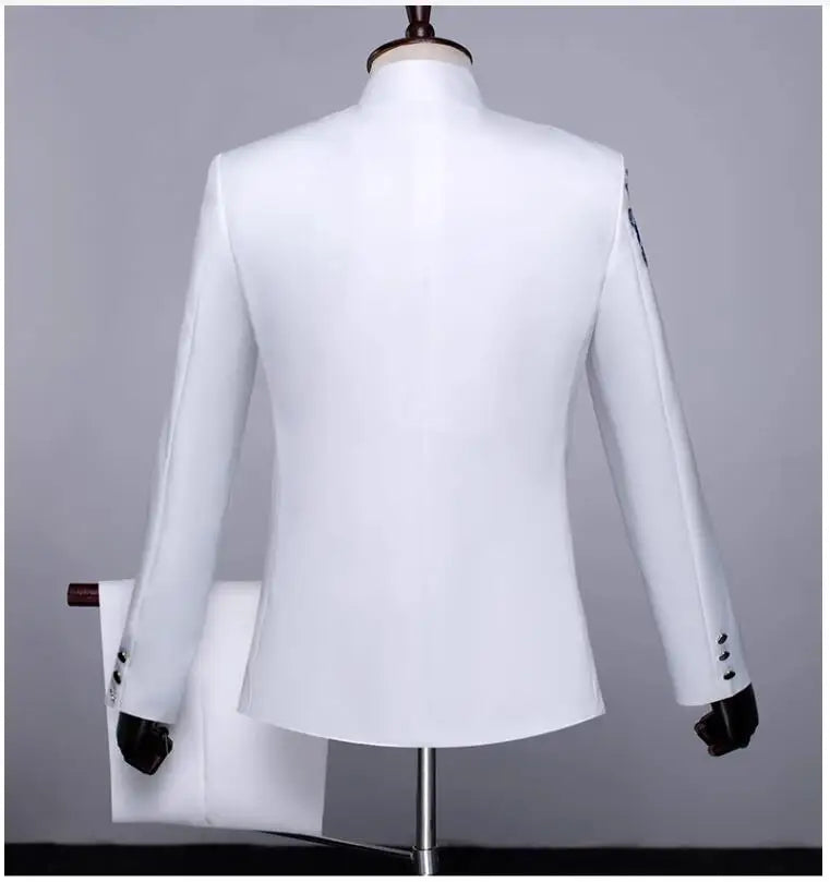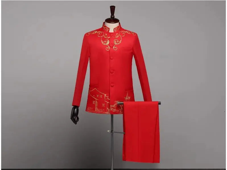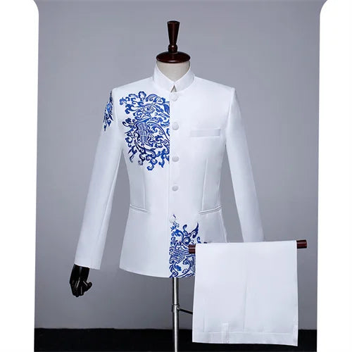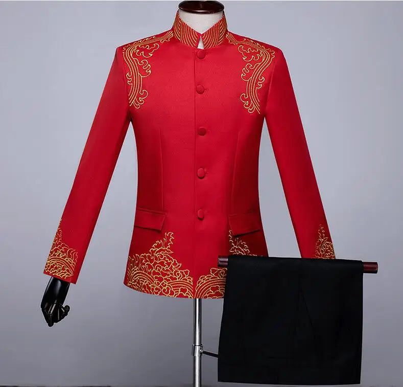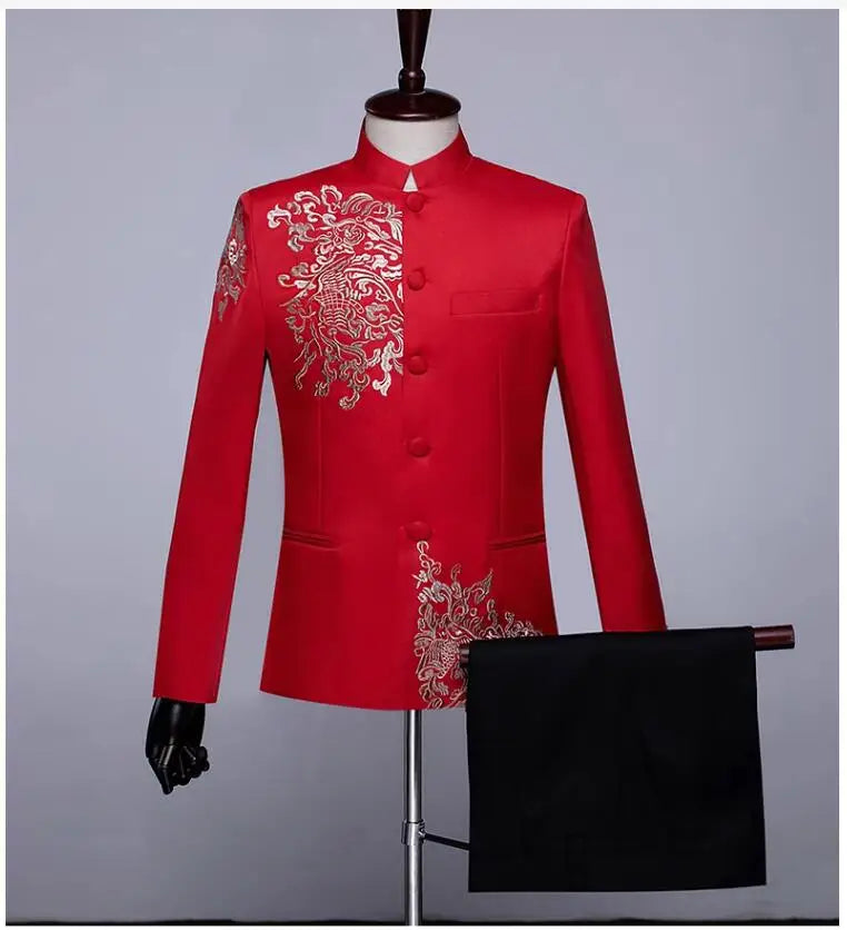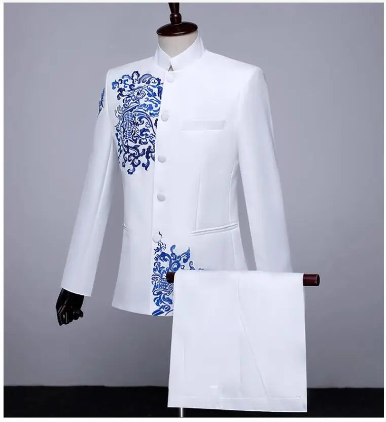New Men Standing Collar Embroidered Suit 2 Piece Fashion Male Business Social Wedding Prom Stage Performance Dress Blazer Pant
