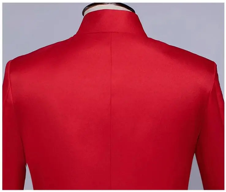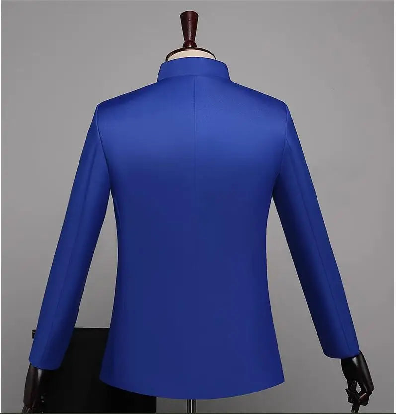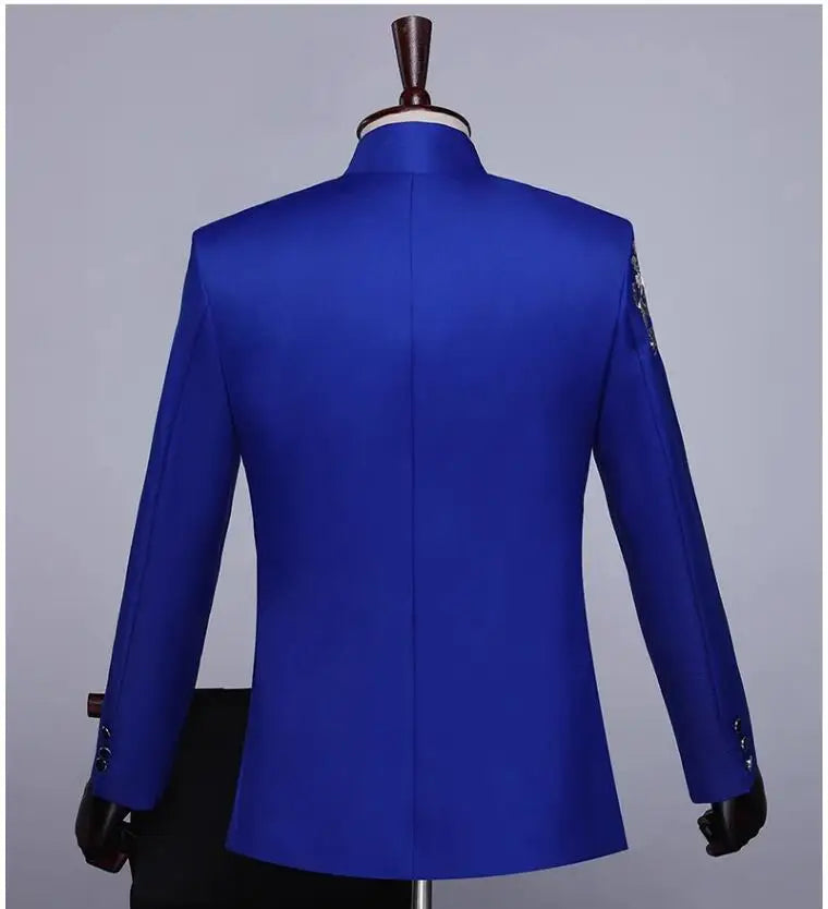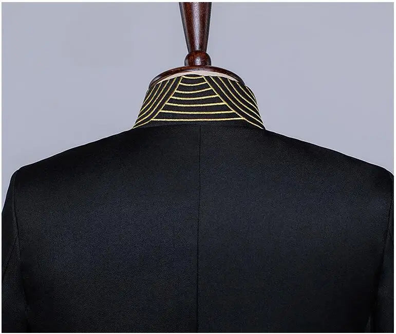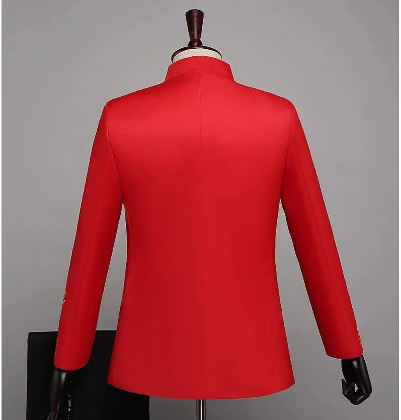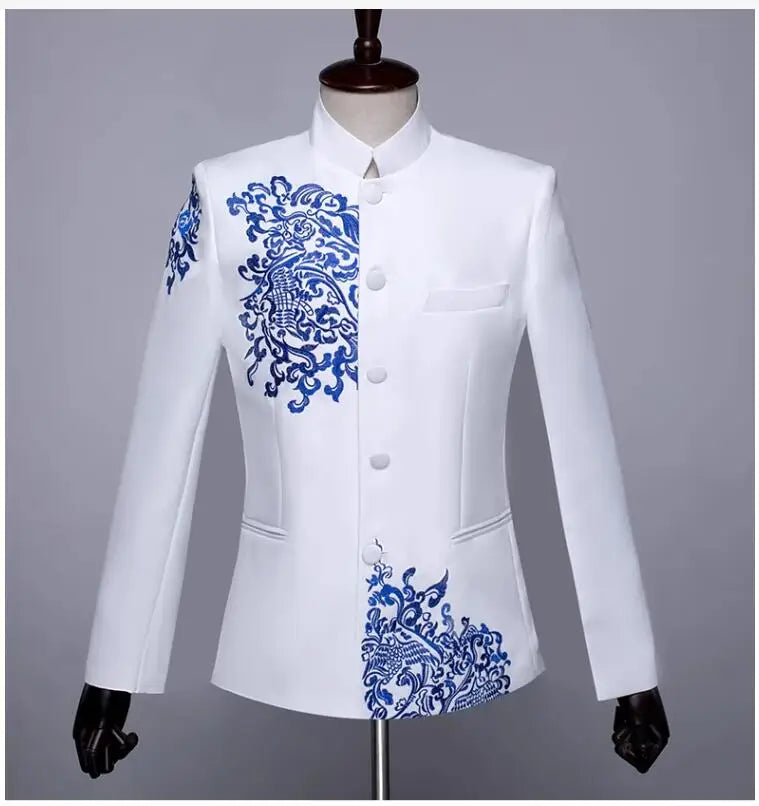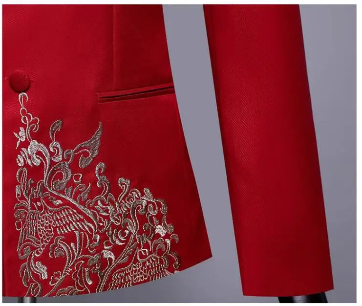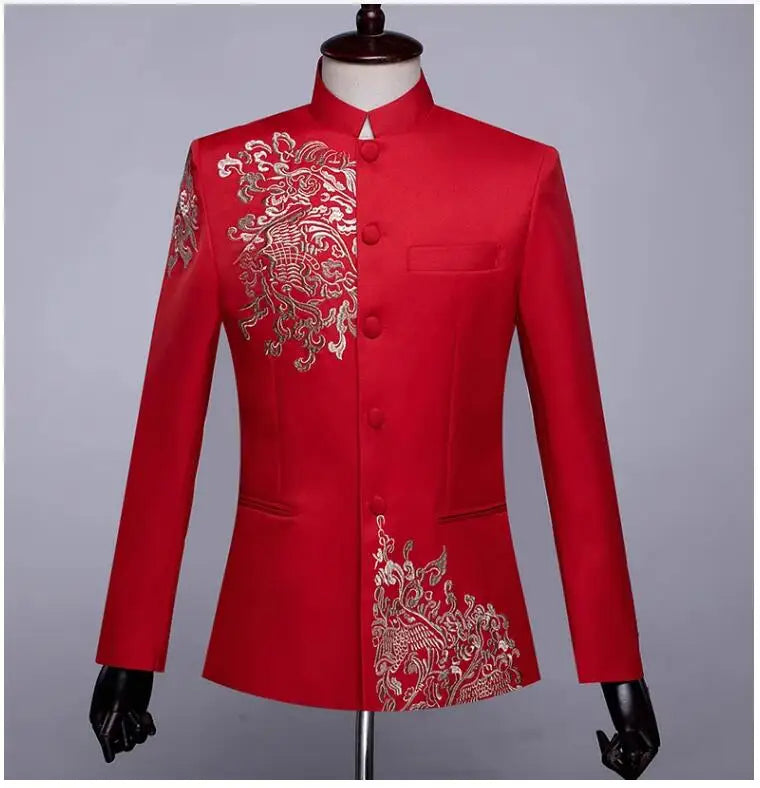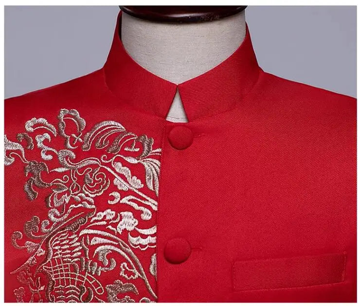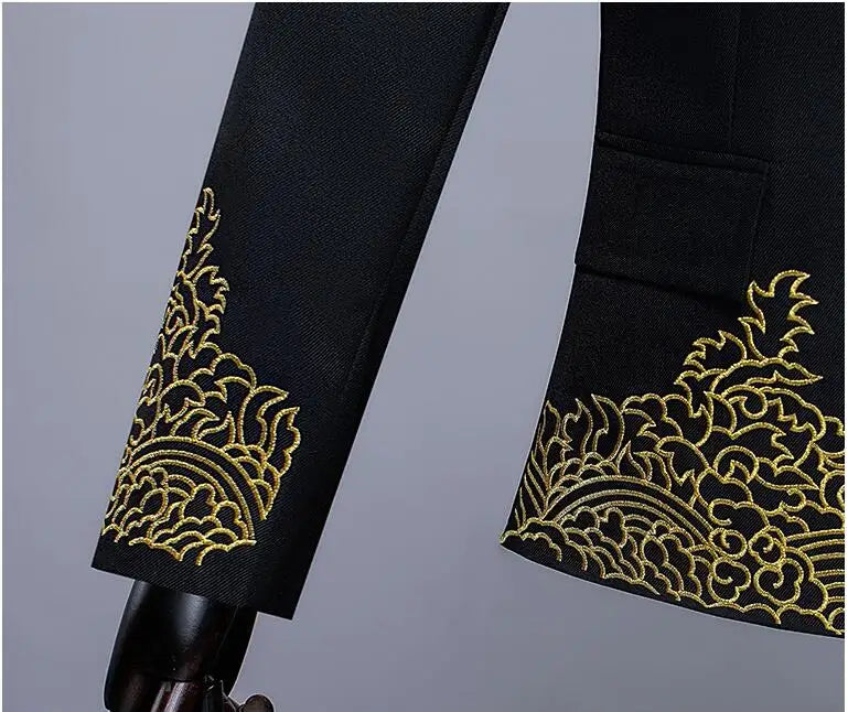 New Men Standing Collar Embroidered Suit 2 Piece Fashion Male Business Social Wedding Prom Stage Performance Dress Blazer Pant