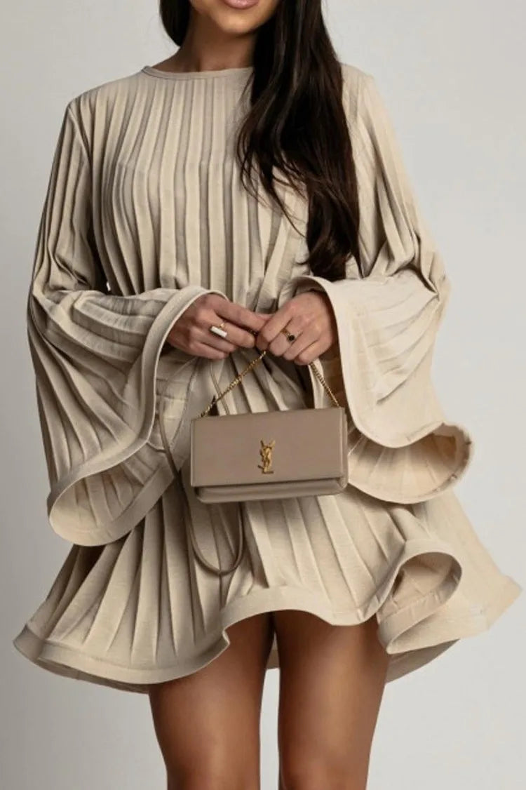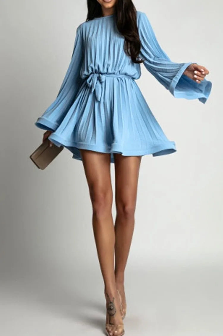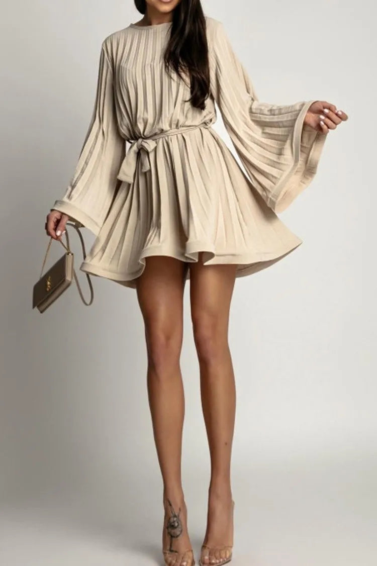 Spring Autumn Elegant Pleated Dress Women Fashion Solid Round Neck Flared Sleeve Lace-up Pleated Mini Dress Women