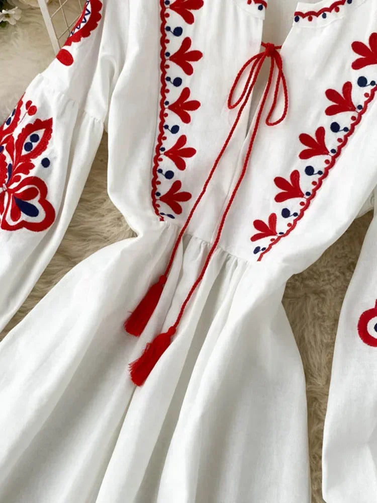 Spring Autumn Women Dresses Bohemian Embroidered Flower O-Neck Lantern Sleeve High Waist Dress All-match Female Vestidos PL393