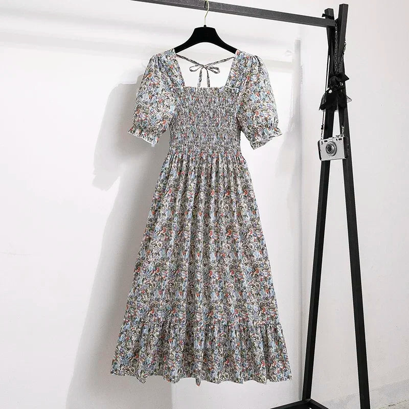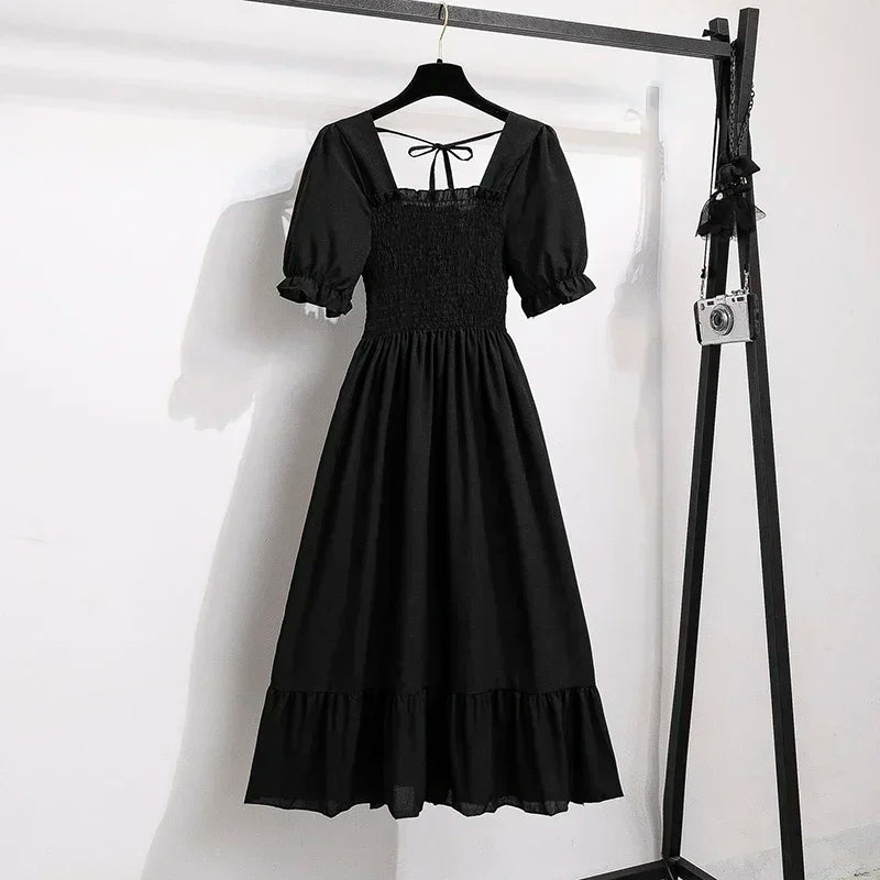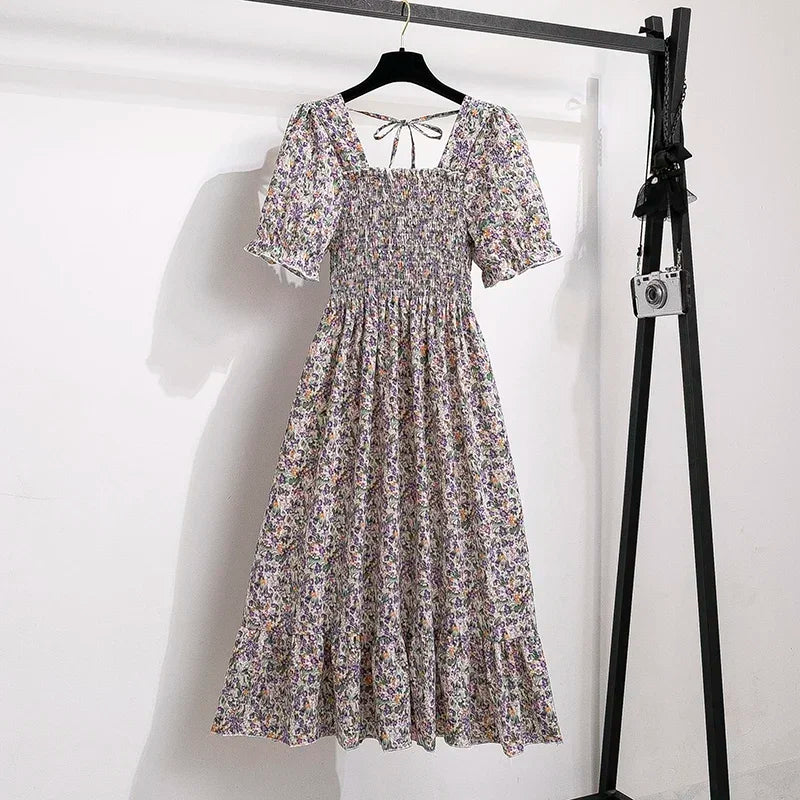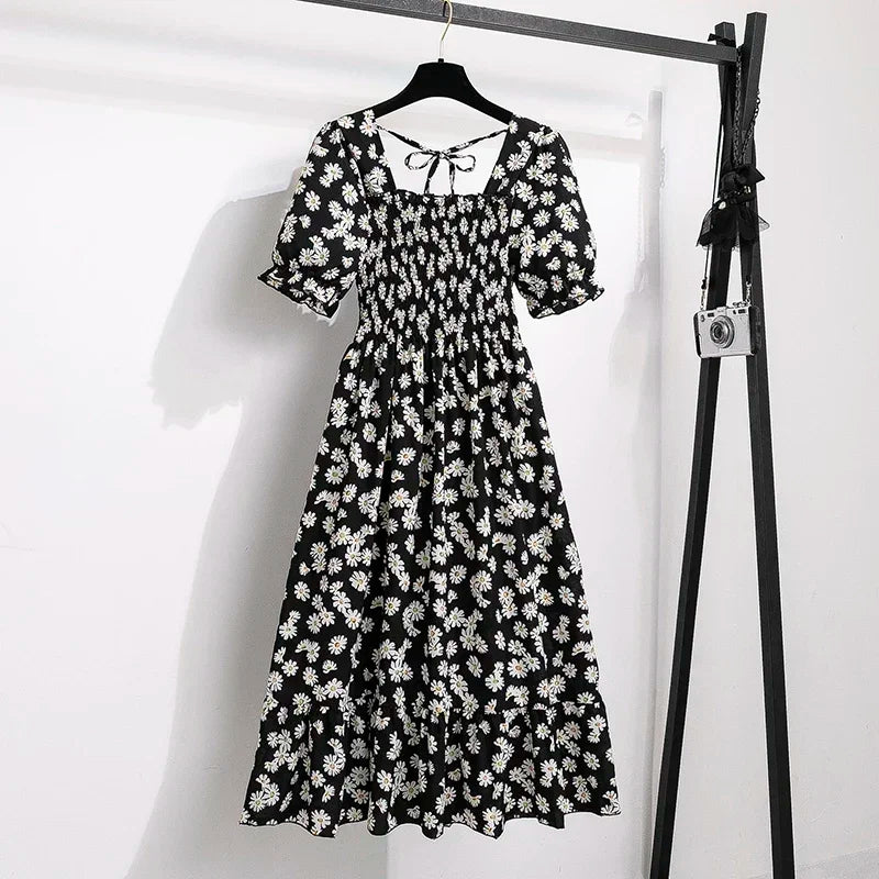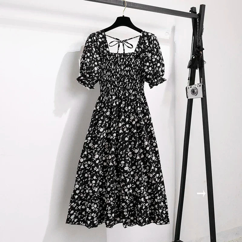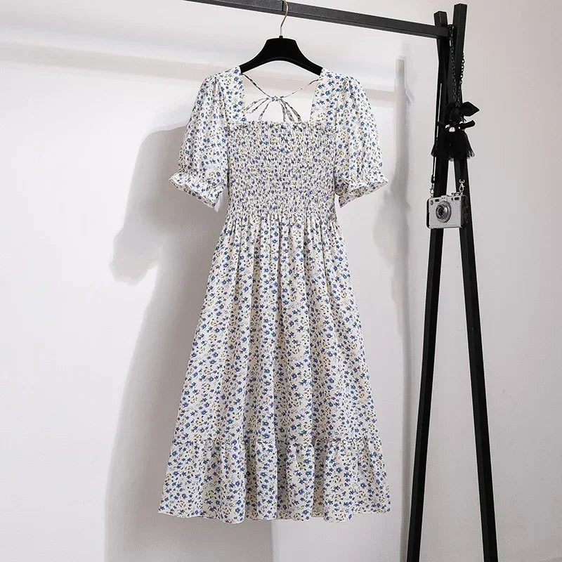 Spring Summer Chiffon Dresses Fashion Female Elastic Waist Short Sleeve Pleated Casual Dress Women A-line Dresses Vestidos