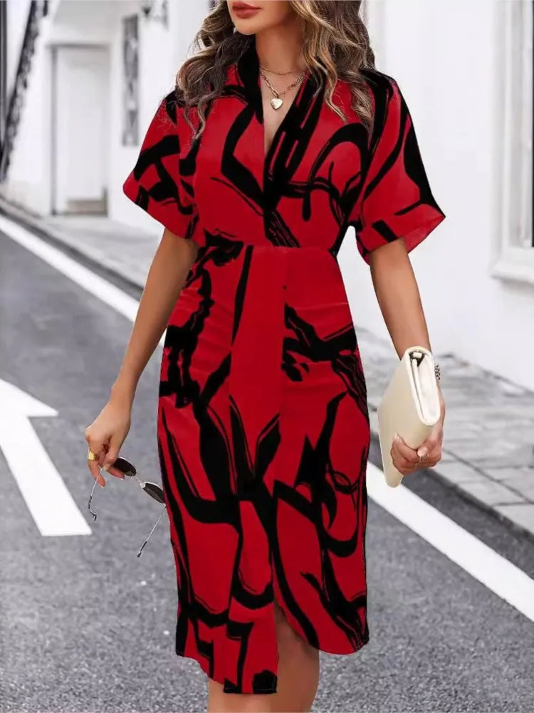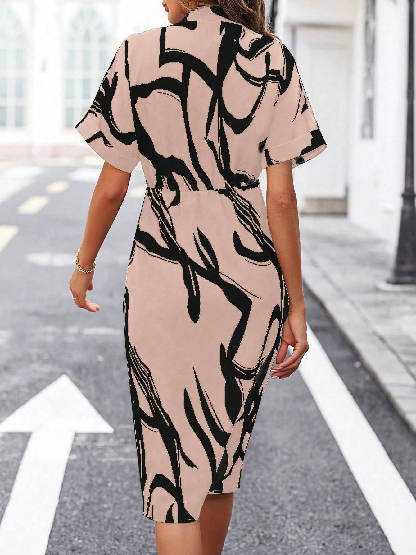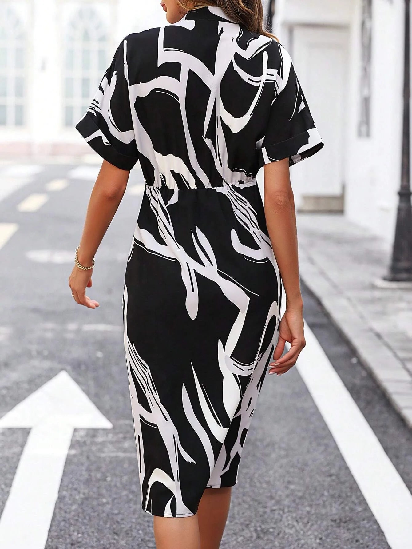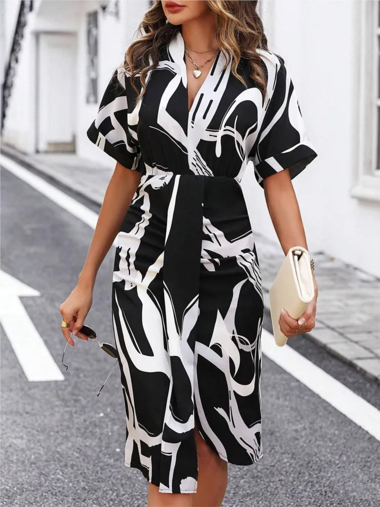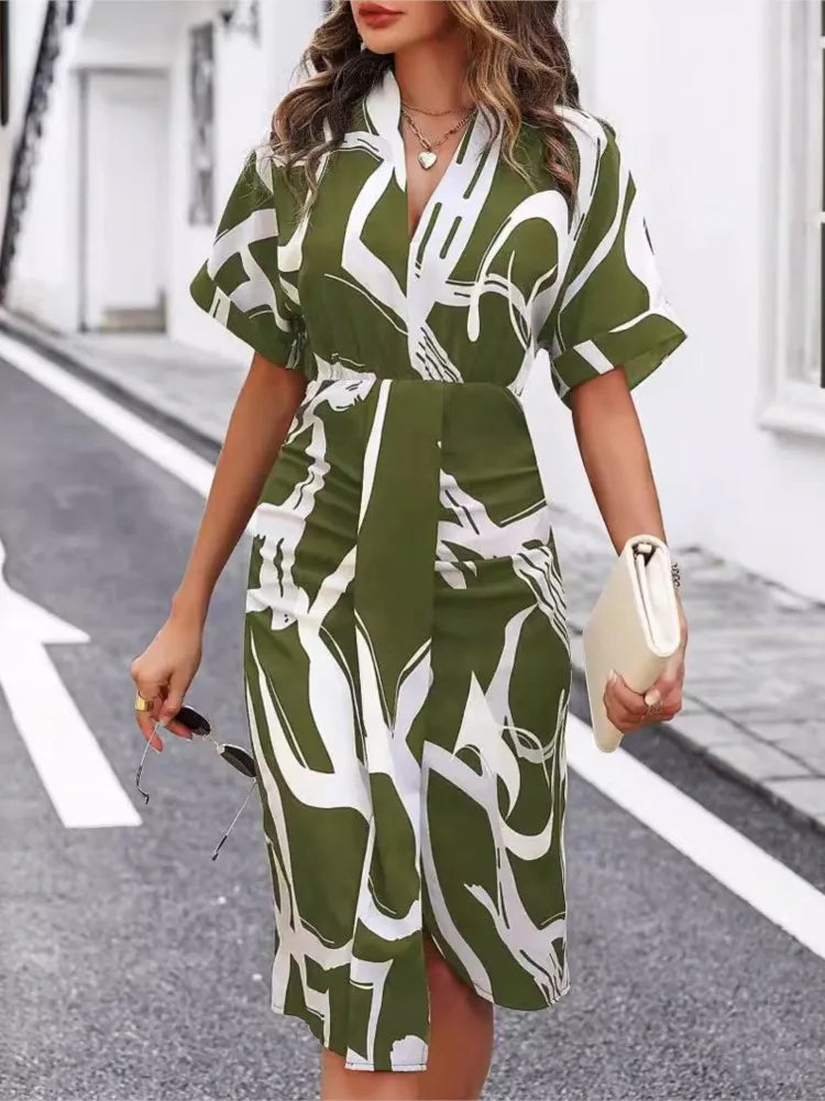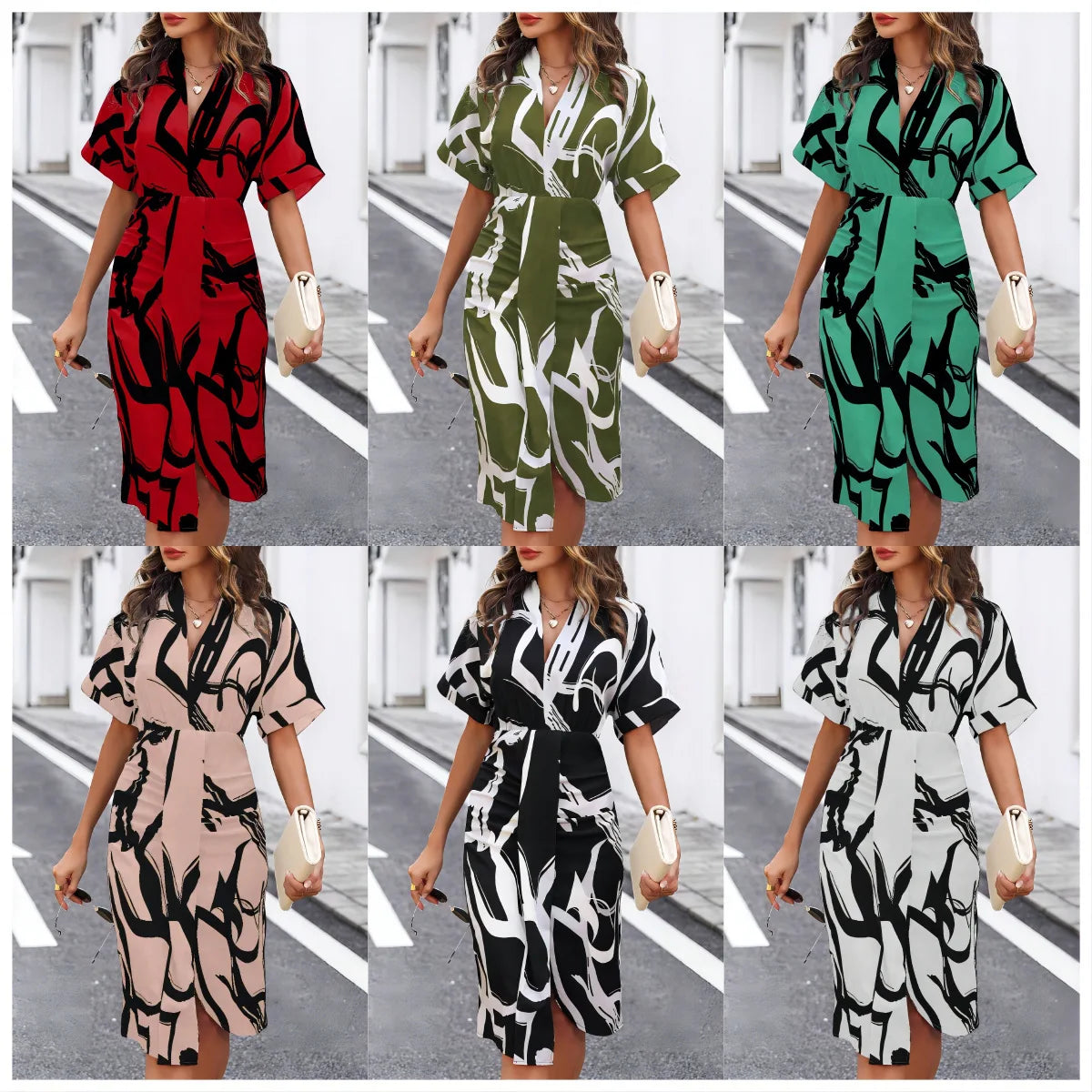 Summer Fashion Patterns Printed Short Sleeve Midi Dress Elegant Women's V Neck High Waist Slim Fit Irregulare Split Dresses Robe