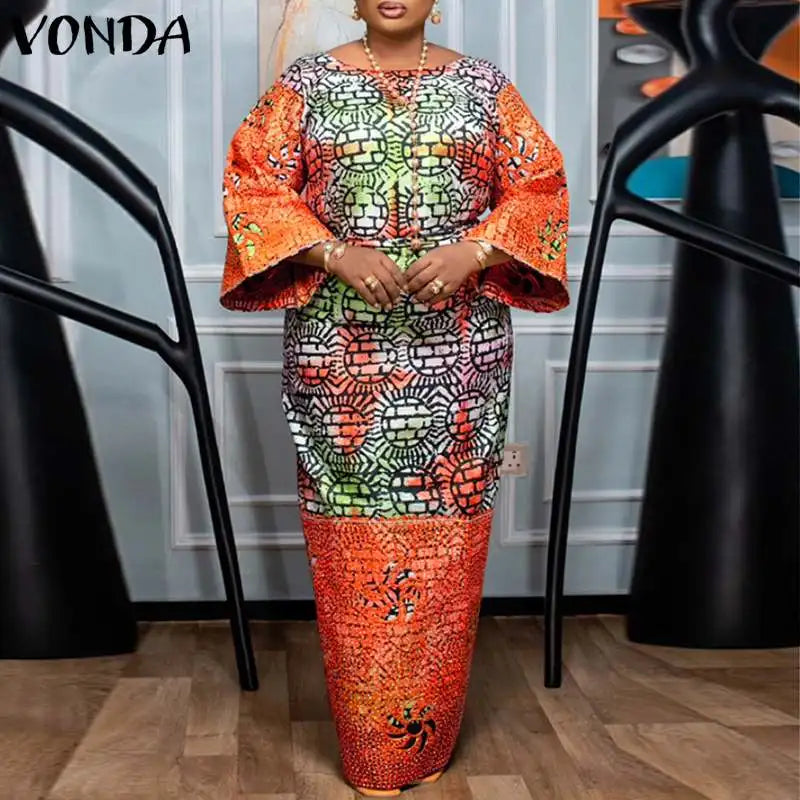VONDA Women Dresses Bohemian Printed Long Flare Sleeve Vestidos 2024 Causal Sundress Robe Round Neck Loose Robe Oversized